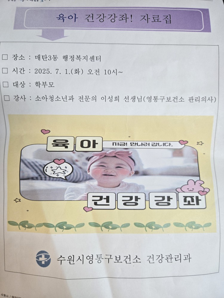지난 7.1 일자에 매탄동행복복지센터에서 소아청소년과 전문의 선생님께 육아 건강 관리를 주제로 강의를 들었다. 큰 기대로 안하고 갔었는데 배운 내용도 많고 기록을 남기고 싶어 정리해본다.