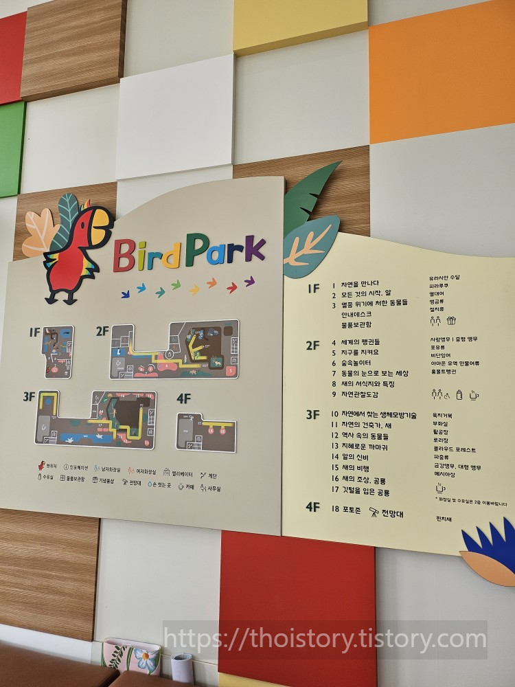 버드파크는 총 4층으로 이뤄져 있는데 1층은 수달, 열대어, 맹금류, 설치류가 있고 2층에는 앵무새, 포유류, 민물어류, 펭귄. 3층에는 거북, 대형 앵무, 파충류 등이 있다. 주로 분포하는 것은 조류 인데 중간 중간 다른 동물 들도 있어 작은 동물원느낌이 들었다.