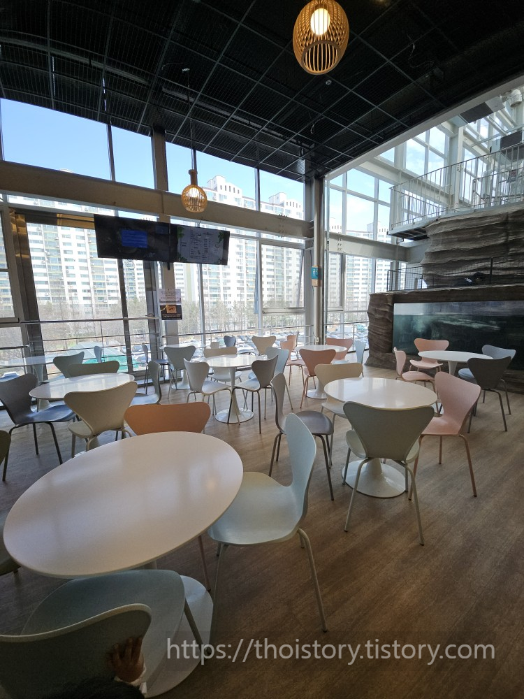 4층쉼터는 대단히 유혹적인곳이었다. 간식 겸 가볍게 먹으러 올라왔는데 1호가 눈이 엄청 돌아간다. 테이블 바로 앞에 펭귄이 있다! 펭귄 뷰로 식사라니.. 펭귄아 고마워! 정해진 시간마다 펭귄이 쇼도 해준다고 한다.