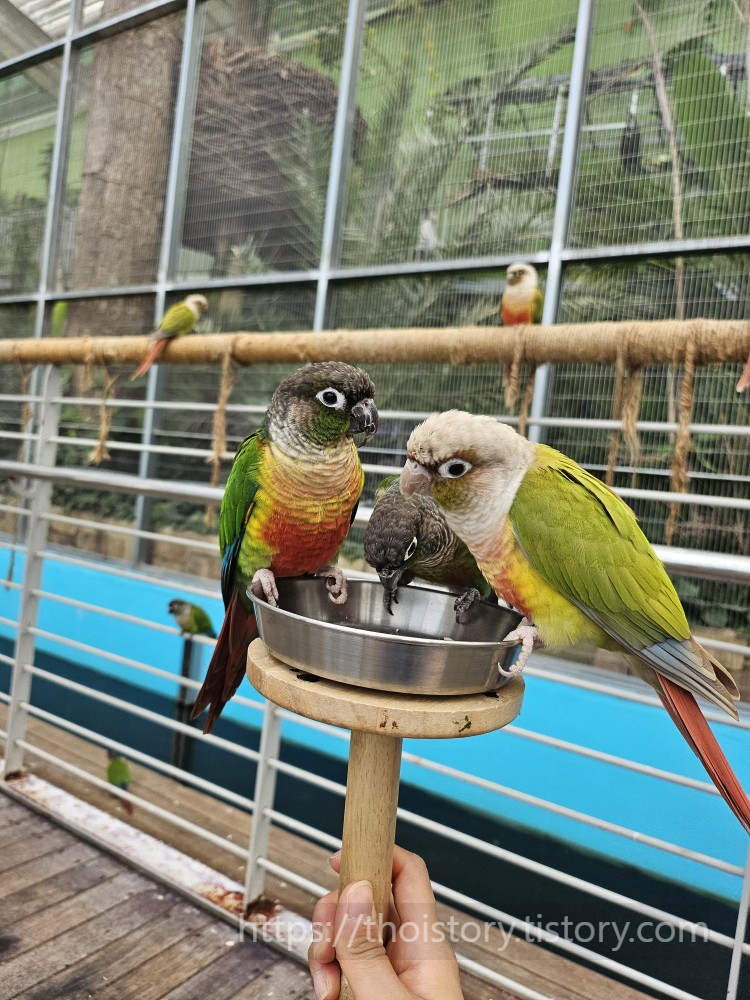 활공장 같은 경우는 앵무새들이 아주 똑똑해서 인지 손만 들면 막 날아온다. 그들의 비행에 의해 센 바람이 느껴질 정도. 우리 중 가장 용감한 짝꿍이 대표로 먹이를 주었다. 난 사진을 핑계로 늘 한걸음 뒤에~~ 항상~~ 내가 있었는데~~ 그대~